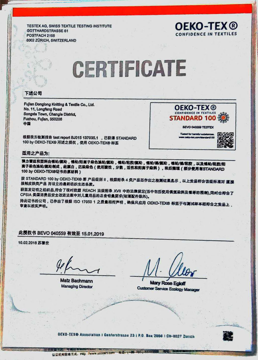 瑞士OEKO-TEX STANDARD 100生態(tài)紡織品認證證書/2018-09-04
